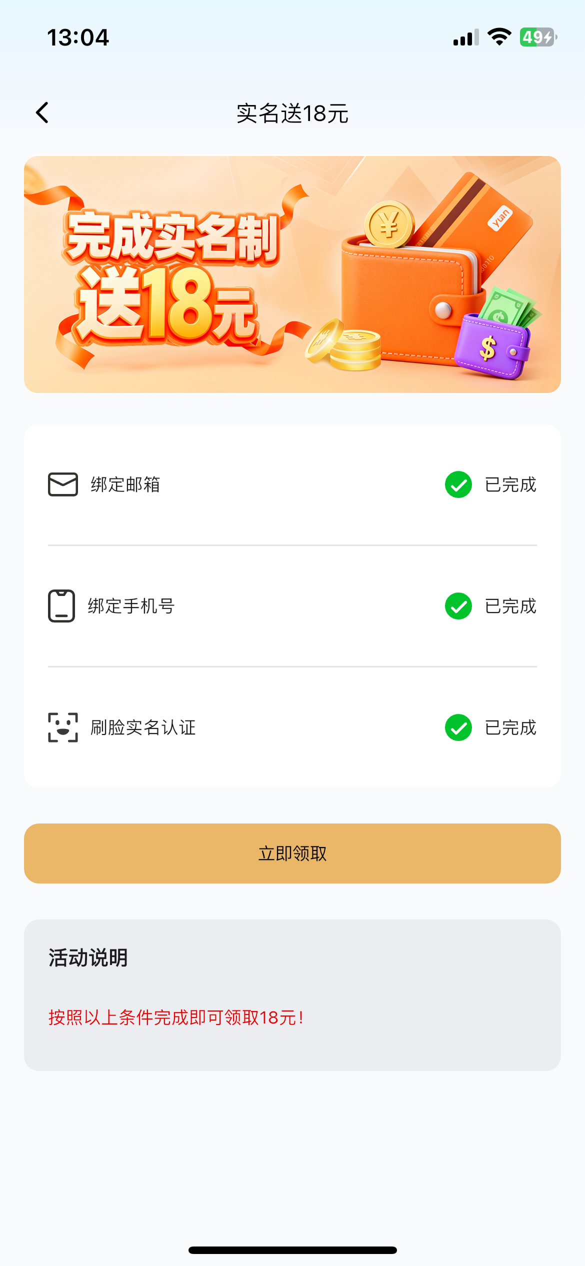 注册实名认证送18