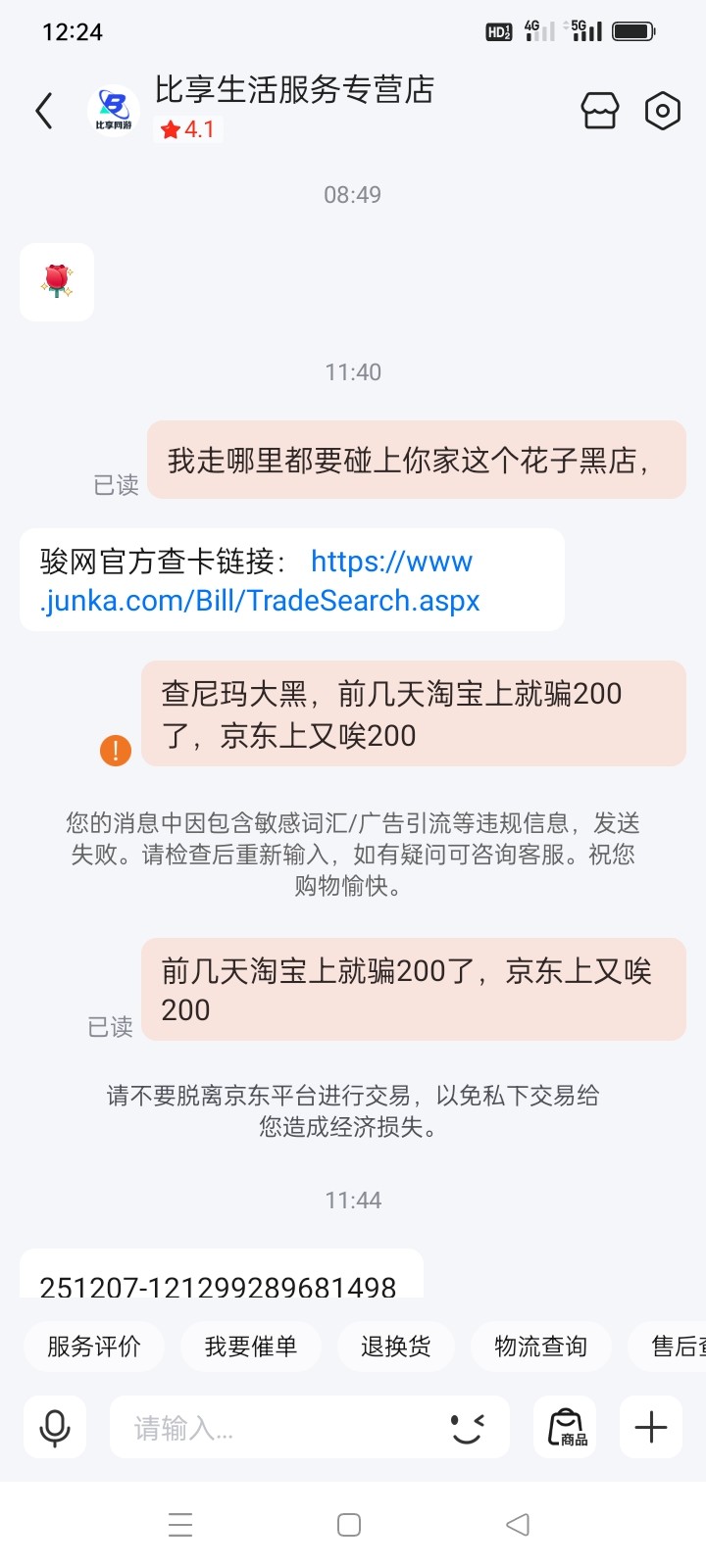 前个星期才在淘宝上上当,昨晚在京东没看店铺名只看见买过就购买了。结果提交了一直上不去回啦了一看又是这狗日的商家。他的套路是也发真实卡给你,但是基本上10秒钟~1分钟就把你卡密绑定了,这就是平台的一个漏洞,小金额的他不搞,专门搞200以上的,所以客服一直拿他这种没有办法,一天不知道要骗多少钱,报警有用吗,有没有老哥给点建议