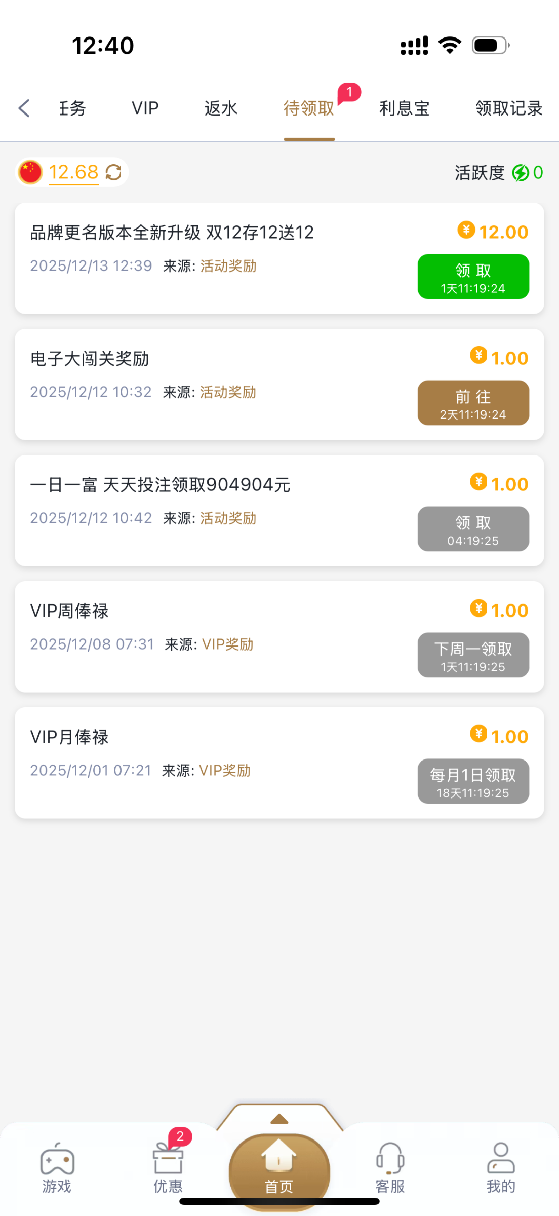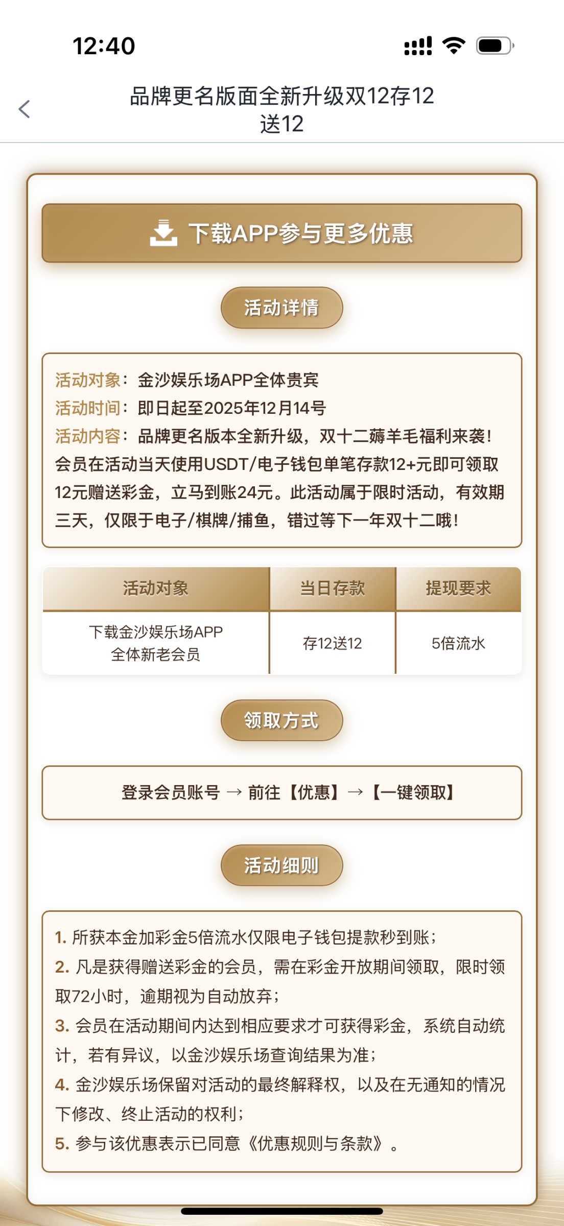 会员在活动当天使用USDT/电子钱包单笔存款12+元即可领取12元赠送彩金,立马到账24元。此活动属于限时活动,有效期三天,仅限于电子/棋牌/捕鱼