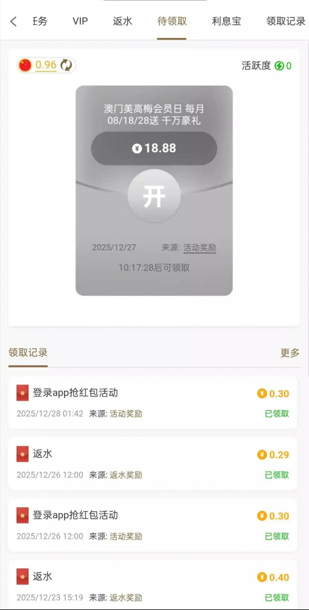 188.top 每个月8号 18 28 领取彩金 应该是充值过就可以领取了 今天中午12点