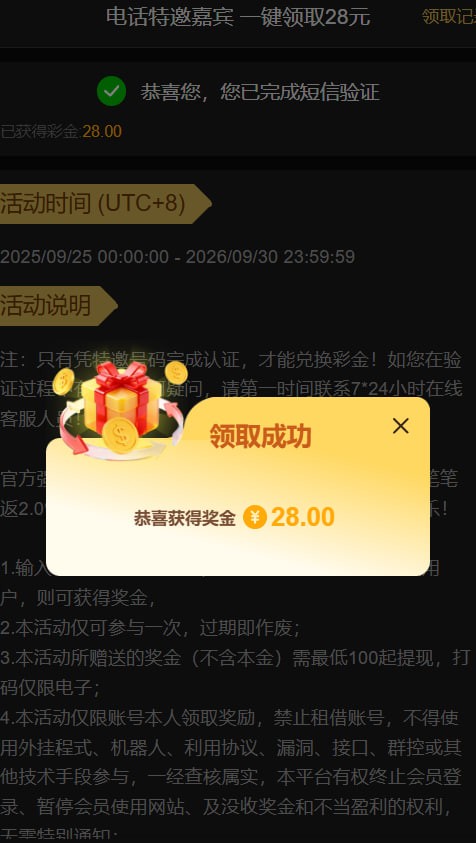 1. 碰瓷特邀,新用户注册优惠大厅自助验证手机号是特邀秒送28/100提,彩金限制自行查阅网站咨询客服。注册链接