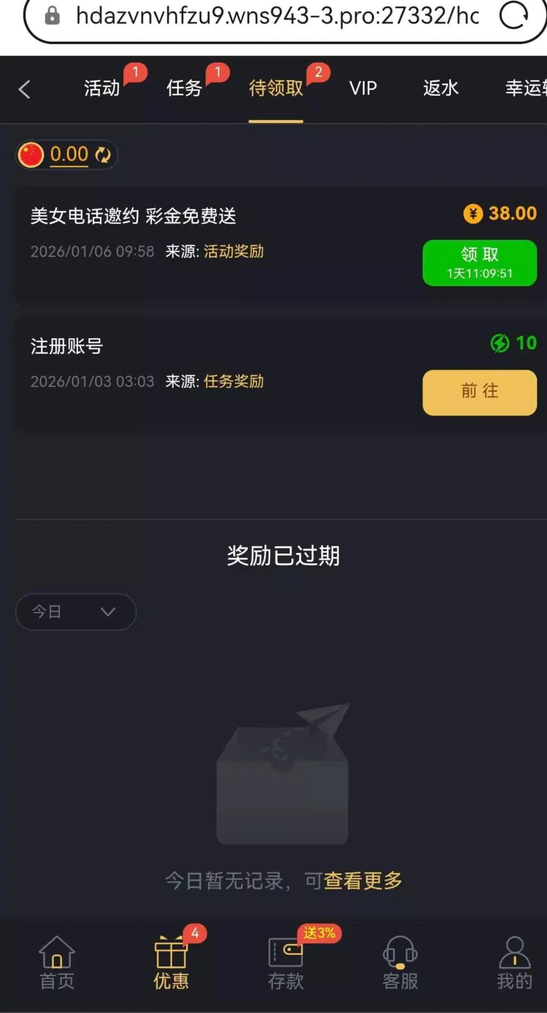 我是3号注册的,今天就打电话过来说电话特邀彩金,登录就有的,我没有充值过,老哥可以去登录碰一下,祝碰到的老哥发大财