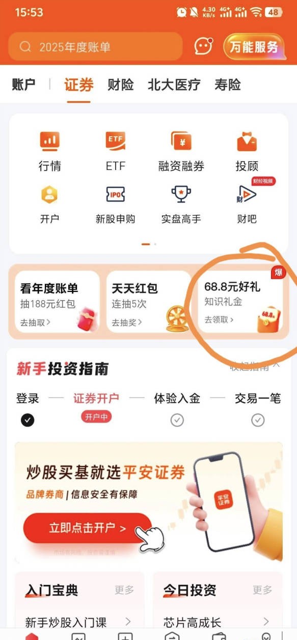没有开过平安证券的老哥人人68.8,第一张图片划圈的地方是入口,平安证券首页那里,现在可以开不用等周一。